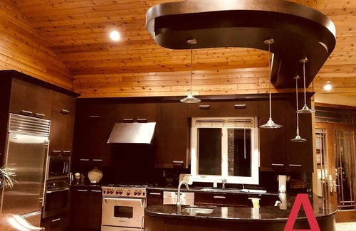 - The 45' Great Room boasts a large gas fireplace; recessed 75" T.V. with built-in surround sound, beautiful ash hardwood flooring, 30' ceilings and massive designer chandeliers. Large custom post & beams and cedar ceilings throughout the dwelling emphasize the Muskoka feeling of this contemporary beauty.