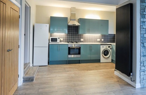 The living room provides a modern luxurious feel with a traditional twist. Its panoramic windows give excellent views over the front garden, the Old Man of Coniston and valley beyond. The double height living room with multi fuel hotpod log burner set within Coniston slate fireplace and exposed slate full height chimney is spectacular. The stove provides warmth comfort and pleasure on a cold winter days, and guests can access the unlimited supply of logs from the log store found at the side of the property.