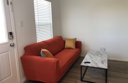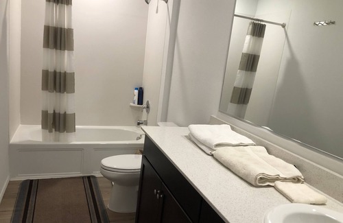 Master bedroom with in-suite bathroom, patio, and backyard. Newly constructed quiet community, access to walking, running and other outdoor activities with a nearby lake. Fully furnished with modern appliances, including washer and dryer. 55 inches Roku TV for the bedroom and 65 inches Roku TV for the Living room. Alexa with touchscreen in the bedroom and premium sound echo dot in the living room/ kitchen area.
