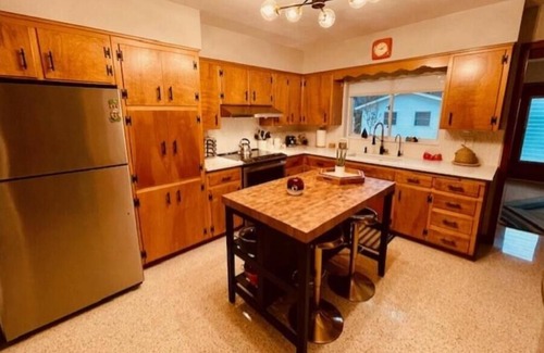 The 1960s landscaping, front entry way and covered carport welcome you to this home. The carport, with a tongue and groove wood ceiling, provides for covered parking and provides for an additional access to the kitchen and laundry room. Behind the front, glass, storm door you access the front living area that is comfortably appointed and has a 55 inch smart/streaming TV. The home is cozy, comfortable and has been tastefully decorated following the 1960s design and theme. With two bedrooms and two full bathrooms this home offers plenty of room and storage for it's size. The front bedroom offers an king bed, smart/streaming TV, dresser and full closet. The back bedroom offers a queen bed with dresser and closet. There is a two seat island in the fully stocked kitchen and an inside dining area that seats four comfortably. Outside, is an exterior dining area that seats five, a gas grill for a back yard BBQ and a firepit with four Adirondack chairs to visit with friends and plan your travel plans while taking the chill out of those Florida winter evenings.