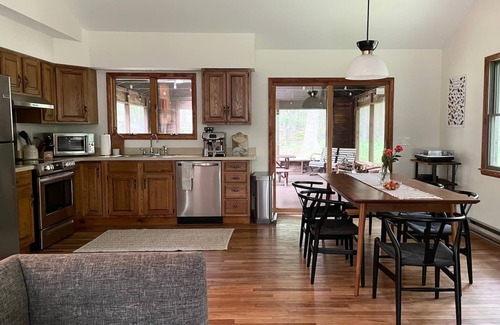 Step into the home from the front entry into our cozy living area with a stone fireplace and an expansive bay window overlooking the wooded lawn. The living area flows into the dining space and kitchen space with views and all the bits and bobs you might need to cook a lovely dinner (or make your own custom coffee - more on that later!)