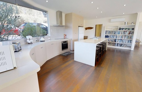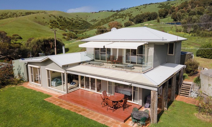 Snellings Beach House is literally about three minutes walk to the beach. It has fabulous sea views and is stylishly furnished and comfortably appointed including with Miele kitchen appliances. The house accommodates eight people (plus one baby), with four bedrooms over two levels. Spacious living and dining areas. There are two bedrooms with queen beds, a further bedroom with one double and a family room with a double, a single, a full size cot and a blackout blind. Outdoor living areas downstairs and upstairs provide further opportunities to enjoy the views. Facilities include highspeed internet, laundry with washing machine, flatscreen TV with DVD, library, weber barbecue, combustion fireplace, reverse cycle heating and air-conditioning.