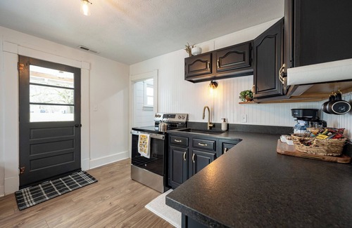 The kitchen features newly painted cabinetry and black leathered granite countertops as well as new appliances (stove, fridge, microwave, coffee maker). The cabinets and drawers are stocked with all of your cooking and dining essentials! Coffee and tea are provided by the host as well as an assortment of snacks!