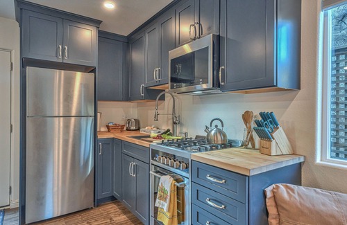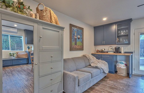 Amenities include beautiful bathroom including walk in shower with rain head. A fully stocked kitchen, with oven and separate coffee/tea bar. The room has one comfortable Queen size bed and a roll out sofa sleeper if needed. There is a mini split system for your heating and cooling needs. From the bed you can enjoy stunning mountain views; and during most of the year you can crack the window and let the sound of the creek lull you to sleep. Literal steps from your room is a beautiful hot tub and pool. Outdoor lighting illuminates the landscaping, but can be turned off if you feel like enjoying the incredible night sky while soaking with a glass of local wine from the Santa Lucia Highlands.