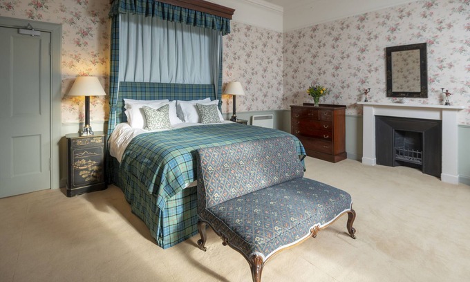 The baronial style evident in the castle’s architecture is reflected in the bedroom with the extensive use of the Maitland family’s tartan for the statement king-size bed and other soft furnishings. The 3rd Earl of Lauderdale adopted the blue and green tartan that belonged to his wife Elizabeth Lauder’s family, and the Lauder tartan has been used as the Maitland family tartan ever since. The grandeur continues into the bathroom where a luxurious free-standing roll-top bath takes pride of place in the centre of the room.