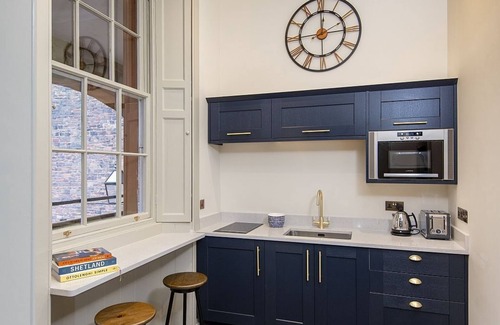 Situated in the South Wing of Thirlestane Castle and formally the castle's sculleries, the apartment has been beautifully transformed into a high-end one-bedroom apartment. Accessed from the mezzanine of the castle’s Cobbled Courtyard, guests look out over the castle gardens to the rear with double-height windows throughout flooding the rooms with light. The traditional flagstone floor in the hallway is a reminder of the apartment’s past, as is the authentic mangle which has been re-purposed into a hallstand.