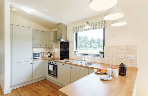 A stunning luxury lodge, perfect for a couples retreat or family break. This boutique and spacious lodge boasts two doubles, one with en suite shower, one twin and a family bathroom with bath with overhead shower. Light and spacious open-plan living/dining area with shaker style kitchen and doors leading to a patio area with outdoor hot tub.