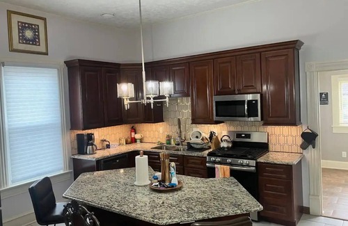 The kitchen features a large winged island, granite countertops, pantry, large stainless steel french door refrigerator, gas stove w/ full oven, a large air fryer, coffee pot, microwave and all the utensils, pots & pans, and kitchen stuff that you will likely need. Check the lazy daisy corner cabinet for pots. Pans are located in the cabinet at the island. The thermostat is in the hallway, the house has a full HVAC system for your comfort.