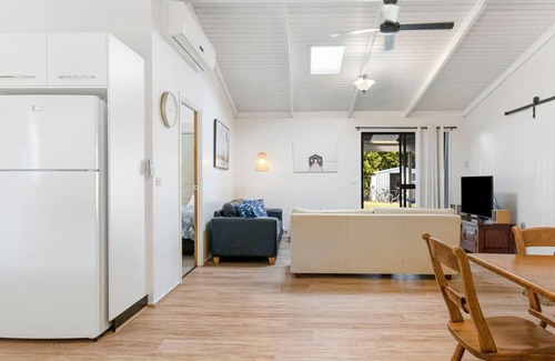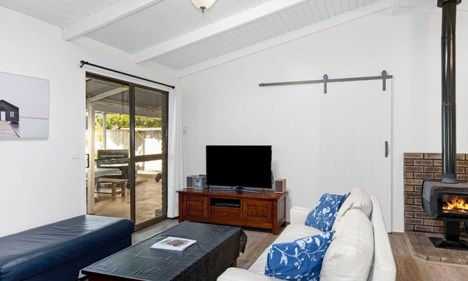The garden area becomes a peaceful retreat after a day of surfing or visiting nearby attractions like the local wineries. An outside patio features a picnic BBQ setup and comfortable outdoor furniture, perfect for soaking up the coastal sunshine or hosting evening dinners.