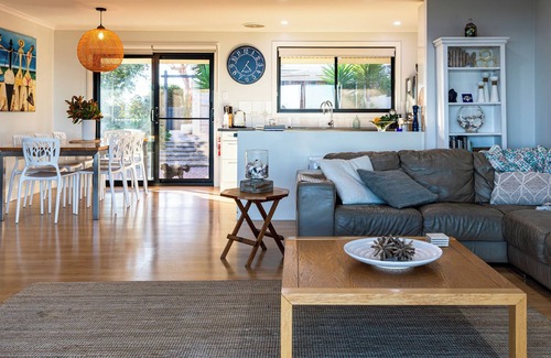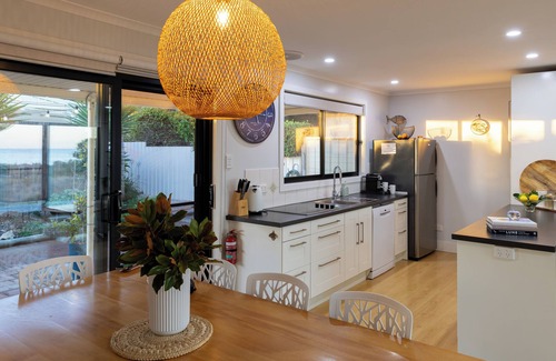 We offer a beautiful beachfront 3 bedroom holiday house where you can sit back and enjoy the magnificent views of Coobowie Bay to the lights of Edithburgh and Wind Farm. There is no road between you and the beach, just step off the front verandah to the lawn leading onto the sand. Internet provision is included, no big downloads please, (bring your Netflix and Stan account details ). House is tastefully decorated and includes modern and quality features. The master bedroom has an ensuite and sliding door to front deck. Bedroom 2 also has sliding door to front deck. Lay back in bed and have that first cup of tea staring at the ocean views and weather of the day. Grass lawns to the front for kids to play.