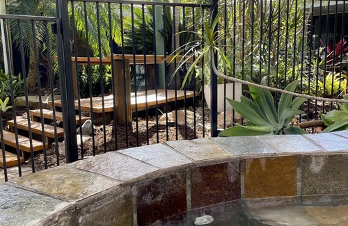 Tropical landscape gardens with private refreshing spa and large patios both side of the house .