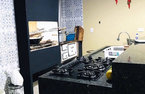 - Cozinha com fogão, exaustor, geladeira, micro-ondas, liquidificador, panelas, louça completa e utensílios variados
