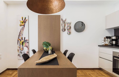 The suite has been tastefully designed with modern decor and thoughtful details to create a welcoming atmosphere. It features a spacious bedroom with a queen-size bed, a bright living room with a sofa bed, and a fully equipped kitchen where guests can prepare their own meals. High-quality linens, comfortable mattresses, air conditioning, and free WiFi ensure a relaxing and convenient stay, whether youre visiting for a short city break or a longer holiday.