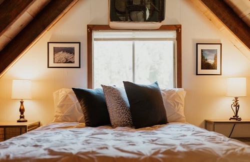 The full size bathroom is situated downstairs. It has a walk-in shower, toilet, and vanity with sink. Upstairs you will find the loft that has a queen size bed along with a twin size bed. This cabin can sleep up to 6 snugly!