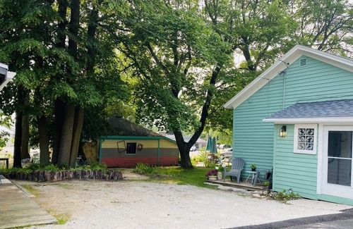 off of the alley , behind the house. Located in one of Sturgeon Bays shopping district. next to a fun antique store and the back yard opens to a very popular coffee shop, 5th and J, and Jefferson Street shops, walking distance to other downtown eateries, Saturday farmers market and beaches.