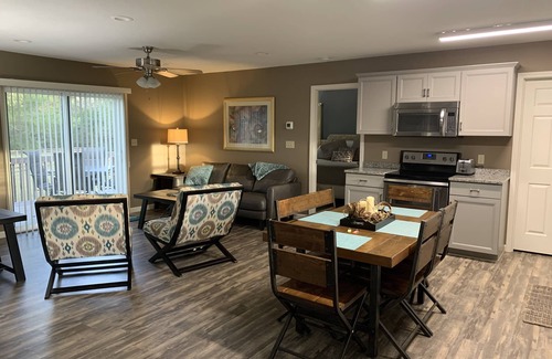New modern tastefully decorated with 2 separate bedrooms one king bed and the other with 2 full beds for your comfort. A common area gathering room off the fully equipped kitchen, stove/oven, microwave, and Keurig, Coffee maker, and stacked washer and dryer.