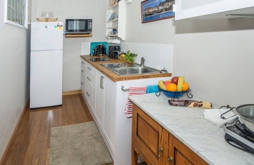 There is a self contained galley kitchen with large fridge microwave single stove burner, electric frypan, kettle, toaster & rice cooker, portable pyrolytic oven and many other kitchen utensils along with a hooded Ziggy barbecue