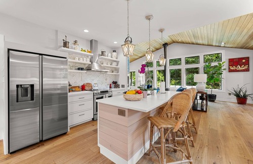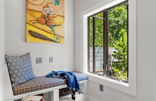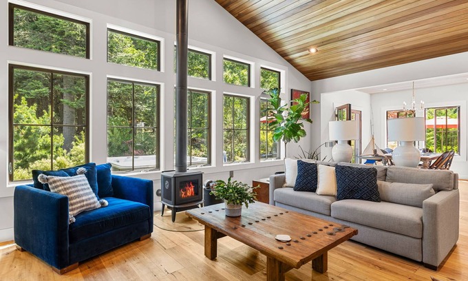 The living room features a wall of windows looking into the forest, perfect for bird watching or curling up next to a woodstove fire and watching the snowfall. The kitchen is open, bright, and fully equipped with All-Clad pans, spices, and all you need to cook your next meal. High-quality linens, Tempur-Pedic mattresses, independent heating/cooling in each bedroom create a luxurious setting for a restful night.