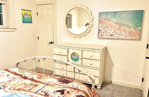 Bedroom 3: The Boardwalk room. Surrounded by sights of the Santa Cruz Beach Boardwalk, this room has a queen bed. A large dresser and luggage racks available for your items. No closet in this room.