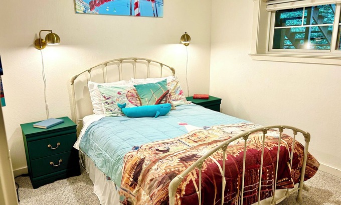 Bedroom 2: This bedroom is inspired by the Roaring Camp Railroad. Queen bed with memory foam mattress and Tempur-Pedic topper. Medium sized TV in the room. Standard closet and luggage racks. PLEASE NOTE: the bunk room access is through this room. So privacy is somewhat limited. The shelves in the room have board games for your group!