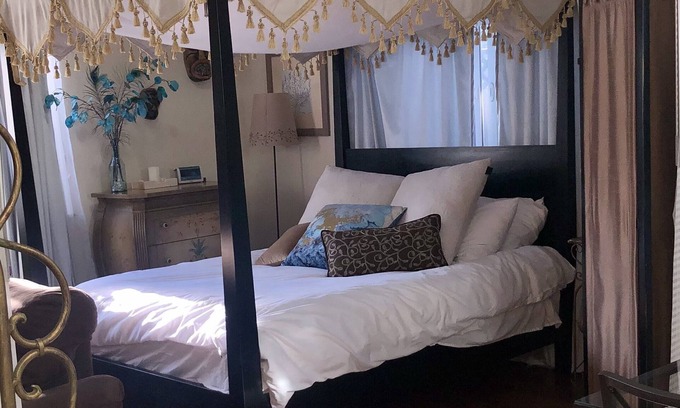 A beautiful, private and quiet studio detached from the main house. You will have your own entrance. A full kitchen and bath [shower, no tub] are included. All linens are provided and the kitchen is equipped with dishes and all cooking utensils needed to cook a meal. The kitchenette has a full sized refrigerator with freezer and full sized oven with a four-burner stove for your convenience.