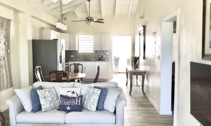 This unique, affordable and contemporary, two bedroom guest house combines all the best that St Thomas has to offer. The combination of amazing sunsets and breathtaking views coupled with modern amenities makes "Yellow Palm", the perfect escape for people seeking to unwind in a beautifully decorated and spacious sanctuary. This two bedroom guesthouse is complete with a king size bed in bedroom one, a queen size bed in bedroom two, fully stocked bathroom and complementary WIFI. Located within quick access to the main road, restaurants, beaches and 10 mins to local popular spot Red Hook, you'll get to enjoy the quiet, beauty and comfort of island life with the modern convenience of all the entertainment and experiences St. Thomas has to offer. "Yellow Palm" is the getaway you've been looking for!
