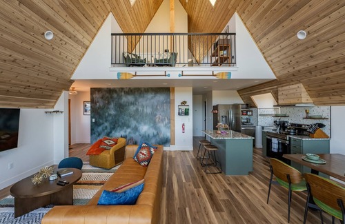 Gather around the large dining table for meals, games, or conversation. The living room offers a full-size sofa and two swivel chairs. Overhead, the loft overlooks the main space through a glass railing, keeping everyone connected while offering room to spread out.