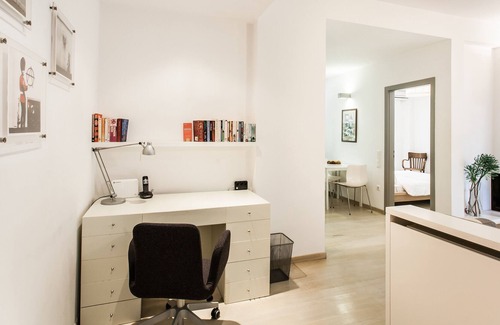 The single main space is simply decorated; contains a desk, a fitted wardrobe with additional useful cupboards, a living area overlooking the plants in the beautiful garden, and an open built-in kitchen with a 3-person dining table.