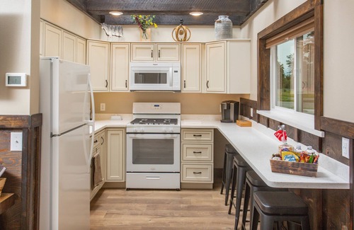 While you're here, you can enjoy all the comforts of home and more, including a rainfall showerhead and a full-sized refrigerator/freezer, as well as an oven and a stovetop. Other amenities include a freezer, towels, an electric kettle, and kitchenware and utensils.