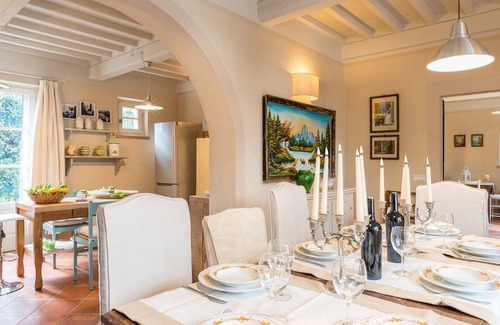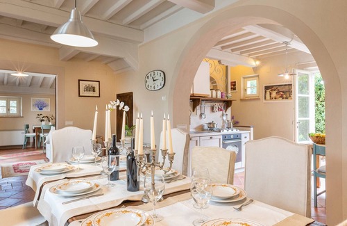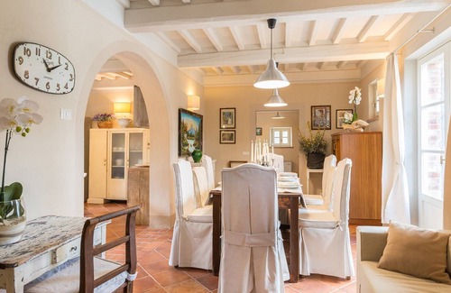 The entire property, completely fenced-in and protected by a double border of leylandii hedge along the whole perimeter, occupies an area of approximately 1 hectare. From the entrance gate, the driveway, bordered by cypress trees and bushes of lavender and rosemary, leads to the parking area and to the luxuriant, well-kept park. A large grassy area contains the rich and varied orchard, with plums, cherries, peaches and grapevines. Holm oaks, lime and lemon trees alternate with bushes of herbs and climbing roses throughout the garden. On a side of the house, embellished with camellias, rhododendrons and hydrangeas, is a wooden gazebo set up with a confortable sitting area, table and chairs and, close by, in front of the dining room French window, is a wood oven and mobile barbecue. At the centre of the garden, dominated by two majestic weeping willow fringed with white roses, the portico, a large wooden structure surrounded by porcelain vine and set up with table and benches, provides the ideal outdoor living area for sitting in the shade and drinking in the peaceful atmosphere. The wooden structure under the portico, accessible from the outside, houses the laundry room.Please notice that photos are taken in spring, therefore flower blossoming, and the colours of the gardens' grass could be different at the moment of your arrival at the villa.