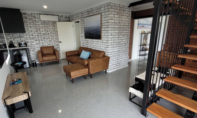 Downstairs you’ll find a queen bedroom with ensuite, plus a second bedroom with a convenient tri-bunk. A third bathroom (with shower, toilet, and laundry facilities) ensures plenty of space for everyone. The downstairs living area is set up for easy comfort with a lounge, TV, bar fridge, and a handy tea, coffee, and toast station.