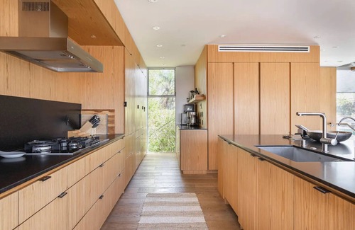 • Large downstairs bedroom is surrounded by floor-to-ceiling glass doors, which slide open for fresh ocean breeze all day