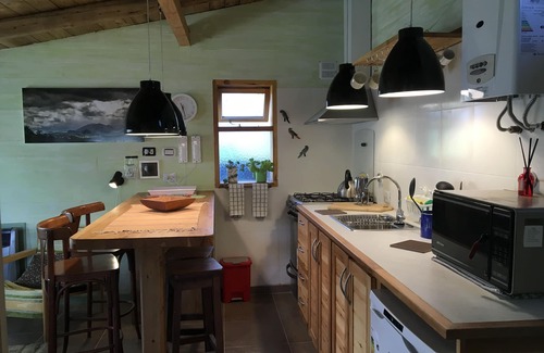 ALEGRÍA is a warm loft of 60 m2, adjoining a coihues grove, fully equipped with gas cooker, microwave, refrigerator, freezer and automatic gas boiler for hot water. In terms of spaces, the environment includes a large bathroom, comfortable bar counter where you can enjoy your breakfast or share a meal with friends, a living room with a view to the lake, a cozy bedroom equipped with King Size bed also overlooking the lake and an outdoor american style barbecue facility.