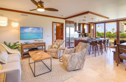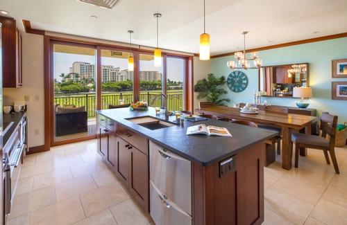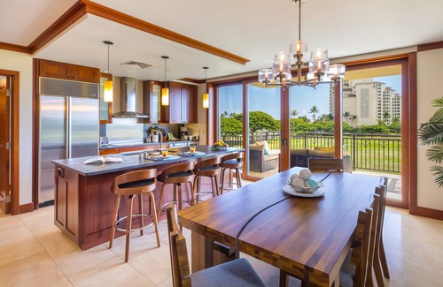 Beautiful 8' tall sliding glass doors slide into the walls creating a seamless transition between indoor and outdoor living to show off the expansive lanai adding an additional 235 square feet of outdoor living space with comfortable seating. The custom designed Roy Yamaguchi signature kitchen offers Sub Zero refrigerator and wine cooler, Wolf appliances and a new LG full size stack washer/dryer all of which add to the conveniences of a condominium vacation rental instead of a hotel room. Interiors include travertine floors, new designer floors in the bedrooms, honed granite countertops and African mahogany doors, windows and trim work. The new furnishings, WiFi high speed internet, DVD players, plus family board games and cards, large flat screen TV's in every room and other high end amenities provide a lifestyle and vacation beyond compare. There is also 1 reserved parking space included with our unit but others can be obtained in case you are traveling with another family or grandparents. For your peace of mind, the property is gated and secured with 24/7 security. Our Villa offers the best of both worlds: a quiet, relaxing, peaceful retreat yet you are just steps away from the beach, pools, and other resort activities. This amazing villa is an ideal serene spot to view the beautiful sunsets, the tranquil lagoons, yet walk to one of the many great restaurants. Paradise!