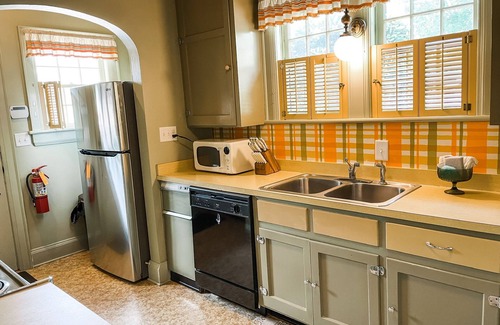 You will love the unique 70’s style kitchen and a touch of 70’s vibe throughout the house. Downstairs there will be a loft type of room with a king size bed and small kitchenette as well a bathroom and another bedroom. This space also has its own entrance from the outside or can also be accessed from inside the house. There is also a small space with a full size bed, that is not considered a “typical bedroom” but offers privacy and just extra sleeping space (see photos). There are two sets of washer and dryers in the house. One upstairs and one downstairs. To summarize the bedding situation there are 3 rooms with king size beds, 2 upstairs and one in the loft style space downstairs. There is a bunk room that sleeps 3 and finally there is a second bedroom downstairs with a full size bed.