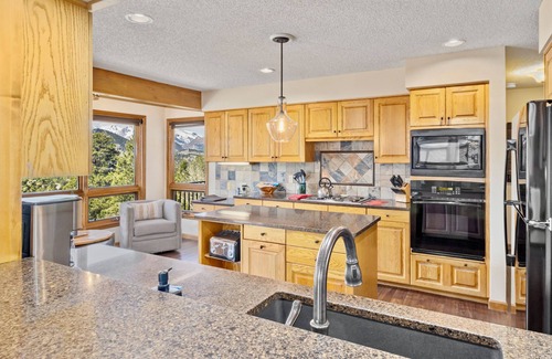 Warm up next to the beautiful and relaxing moss rock fireplace while you enjoy the panoramic views every way you turn. The furnishings in the home were designed for relaxation, from the restful, neutral color scheme to the cozy, embracing leather couches. When it's time for a meal, the rustic dining table with stylish padded chairs welcomes you to sit and enjoy the downtime. For outdoor dining, the al fresco dining table provides an uninterrupted mountain view that will encourage you to take deep breathes of the fresh mountain air. Notice the gas grill, ready for you to use while you enjoy even more time soaking up nature. Inside, the eat-in kitchen is well-appointed with all the major appliances.