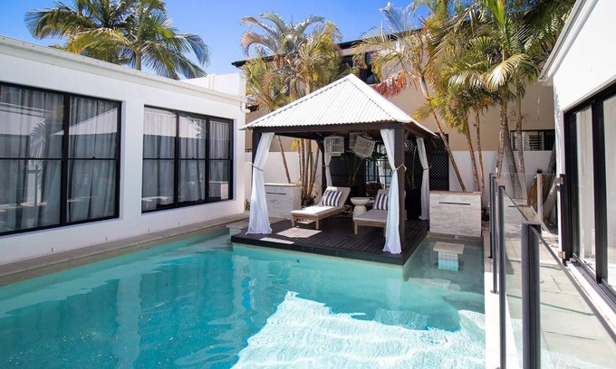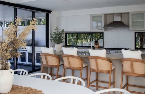 Indulge in a waterfront luxury escape at this spacious 5-bedroom Helensvale home, perfect for up to 10 guests. With a chic coastal aesthetic and plenty of places to relax, enjoy the private home theatre, stunning pool with Bali hut, and a sprawling deck overlooking tranquil waters. Whether you're lounging by the pool or dining by the water, this home is the ultimate destination for relaxation and unforgettable memories.