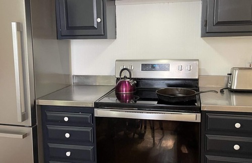 This is a Duplex house - you will have one entire side which has a queen bedroom on the first floor and a Queen bedroom and bathroom on the second floor. The stairs to the second floor have a handrail but they are steep. The apartment features amenities like Roku TV, WiFi, Back Yard Gas Grill, washer/dryer in Basement, fully equipped eat-in kitchen.