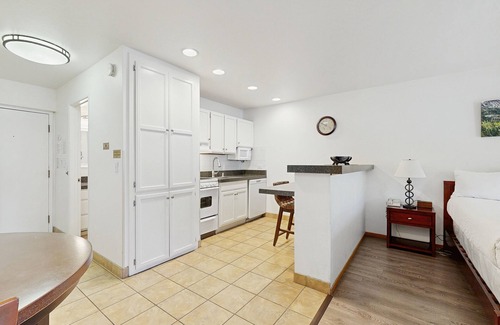 Overlooking the pool at the Lodge, your deluxe studio boasts a fireplace and a full kitchen that is well-equipped for prepping your favorite recipes. Plus, there’s a kitchen bar and two-seat dining table for mealtime, board games, and puzzles. Step out on the furnished balcony with a view of the pool for a breath of fresh mountain air anytime.