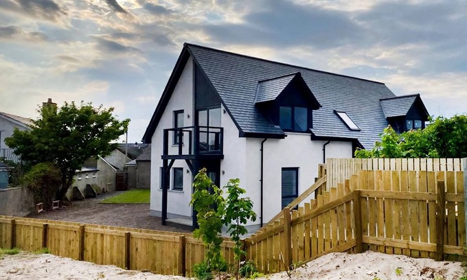 Bathroom: Bath, Cubicle Shower, Heated Towel Rail, Toilet. Air source heat pump central heating, electricity, bed linen, towels and Wi-Fi included. Travel cot and highchair. Welcome pack. Enclosed gardens with sitting-out area and garden furniture. Private parking for 3 cars. No smoking.. On The Beach is superb modern detached house situated right on the seafront in the pretty fishing village of Balintore. This stunning architect-designed house will appeal to families and groups wishing to enjoy the ultimate beach holiday. The main living room is on the first floor. It has its own balcony, maximizing the stunning panoramic views across the sea and along the sandy beach. There are four generously proportioned bedrooms (three with en-suite facilities, and a separate family bathroom). The spacious master bedroom also has a dressing room. The downstairs kitchen is exceptionally well-equipped with all modern appliances and the dining room is separate. Balintore and the adjoining seaside village of Shandwick are completely unspoilt and provide idyllic seaside holidays without the crowds. Dolphins, seals, porpoises and a wide variety of seabirds are seen in the locality. The village has a local store, pub, café and restaurant, all within a short walk from the property. Further facilities are available in the nearby town of Tain.