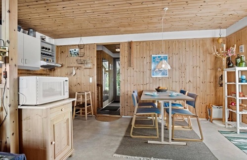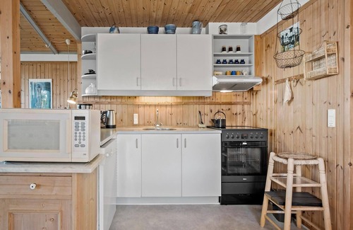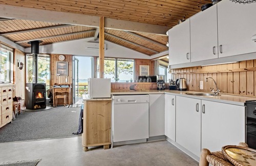 Look forward to a pleasant vacation in this wooden house on the south coast of the island of Fyn. The focal point of the house is the large combined living room and kitchen, where you can enjoy culinary delights in the modern equipped kitchen and at the same time chat with the other guests in the comfortable upholstered furniture. The wood-clad walls and ceiling of this room make a bright impression, and the large sections of windows and the sloping roof create a nice, open atmosphere. You can share a meal with your family or friends at the dining table and then have a game night in the sofa corner. Or on warm summer evenings, why not open the door and retreat to the large terrace, where you can end the day with a sea view? This is also a great place to enjoy a cup of coffee in the morning.