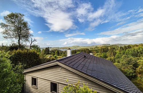 In an idyllic location and with a view of the Radfjorden, this inviting house welcomes you, where you can spend a relaxing time in beautiful natural surroundings. A cosy living experience awaits you in the rooms, which have a rustic feel thanks to the use of lots of wood. Enjoy the fantastic view while relaxing on the sofa and look forward to cosy evenings by the crackling fireplace.