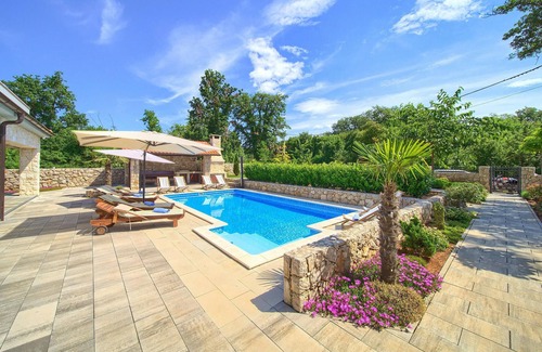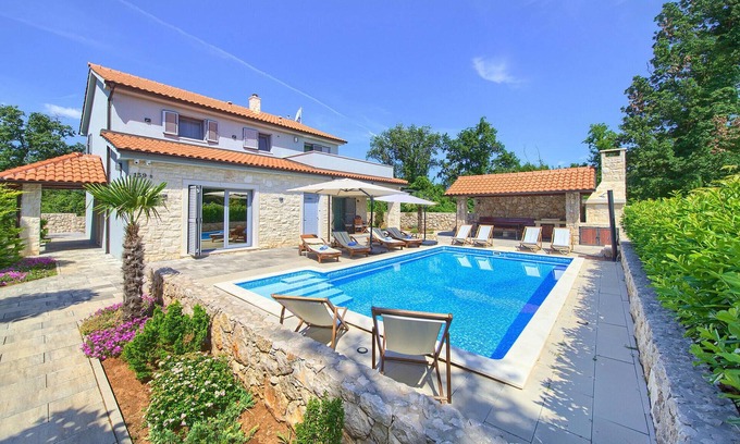 The luxurious Villa Gabrijela is the perfect choice for true relaxation and enjoyment of nature. Since the villa is located on the island of Krk in Kras, it offers you the opportunity to escape from reality and relax far away from the hustle and bustle of everyday life by enjoying the beautiful scenery. The villa is superbly furnished and, more importantly, offers you complete privacy. The villa consists of four superbly furnished bedrooms with double beds. Each of the four bedrooms has a television and is air-conditioned. The bedrooms are spacious and airy. Villa Gabrijela can comfortably accommodate 8 people (+3 extra persons). The villa also has three bathrooms and a wellness area created for your ultimate comfort. The villa has a fully equipped, modern kitchen that will cater to all your needs. The kitchen opens onto the dining area and the cosy living room. This bright space is open-plan and allows guests to enjoy magnificent views of the garden and swimming pool. The villa is 185 m² in size and extends over an 800 m² plot. The outdoor area also offers a marvellous swimming pool with sun loungers. The pool is 32 m² in size. The area around the swimming pool is directly connected to the barbecue area, where you can enjoy freshly prepared meals with your family and friends. * We also offer yoga classes during your stay at Villa Gabrijela. You can choose between morning and early evening classes. Classes are organised according to your wishes and possibilities and led by certified teacher E-RYT 200 Gabrijela Prulj Leli. If you choose some of our yoga packages at special guest prices, we also offer free bioenergetic healing treatments according to the method of Zdenko Domani (optional). Please contact us for further details. Give your stay an added value! * The pool is heated and open from 15/04 to 12/10. The villa has an outdoor jacuzzi and sauna. * For reservations of less than 5 nights, a cleaning fee of 150 will be charged. Pets are allowed in this property at the owner's discretion or for a fee. Please note that this property does not accept youth groups or stag and hen parties. A youth group at this property consists of people under the age of 30. Do not book this property if you are a youth group or stag party as your booking will be refused after booking, which may also be on arrival at the property or during your stay, and you will not receive a refund.