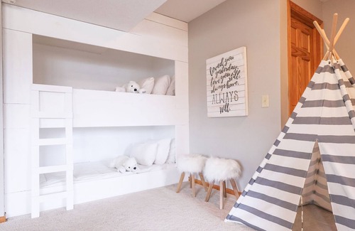 You are sure to enjoy a memorable vacation in this fully furnished, 4+ bedroom, 2 bath lake house! The main floor has two bedrooms one with a king size bed and one with a queen size bed. The main floor sun room can also be closed off and converted into a bedroom with a very comfortable queen size sofa bed with memory foam mattress. The loft features a king bed reading nook along with 4 twin bunk house style beds. In the lower level you will find a bedroom with a king size bed as well as a cute nook with 2 twin bunk beds and a full size sofa bed with a memory foam mattress. The dining table can seat 10 plus the open kitchen with an island and a peninsula can seat additional guests perfect for family dining.