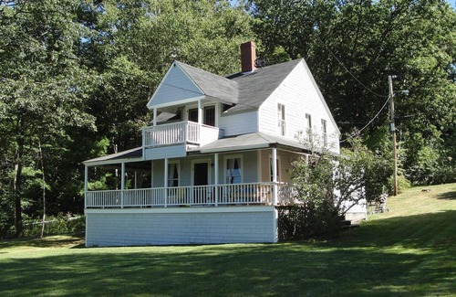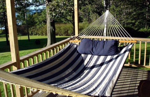 The wrap around porch has a picnic table for outdoor eating and a hammock for relaxing. A propane bbq for outdoor cooking. There are two upper level balconies expanding two of the upstairs bedrooms. Perfect reading nooks. The large sunny yard is perfect for playing wiffle ball, frisbee, swinging on the tire swing, and sun bathing.