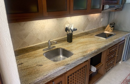 You can also walk to the fully stocked larger grocery store a block away and cook your own meal in the condo's kitchen if you prefer. The full-sized refrigerator will hold all the food you want. Pots, pans, utensils (including new knives), coffee maker, toaster, blender and more are there for you to use. The marble counters are beautiful and easy to clean.