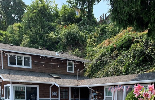 The renovated home has a cozy, yet efficient design to accommodate families or couples, sleeping 7. The first floor is open and includes the kitchen, dining, and living space, plus a half-bath with a nook for the washer/dryer. The upper floor has two spacious king bedrooms with a picturesque deck, a kids’ room with twin bed (complete with toy box, books and an abundance of family board games), and a bathroom with a private area for shower / toilet (sliding door) and a separate area with double sinks, for efficiency to accommodate more than one at a time. A cozy bungalow room is detached from the main home and can accommodate an additional two guests on a queen sleeper sofa, or just provide a place for the kids to get away and watch the big screen smart-TV or play games. The hot tub is located on the mid-tier of the property with a 260 degree, breathtaking panoramic view of the Sound and Mt. Rainier (included in rental during peak season. Available for an added fee, off-season).