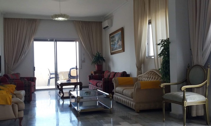 14th floor apartmentin the heart of tyre ,calm apt over looking the sea and roman ruin, 5min walking to the beach ,resturants coffee shops and downtown.10 minutes walking to the bars.three bedrooms four bathrooms,living room and two salons.enjoy the balcony view with calm frsh air. aircondition in every room hot and cold.equip kitchen clean fresh towels and sheets.wifi and television you can iron and hang.i am ready for your needs