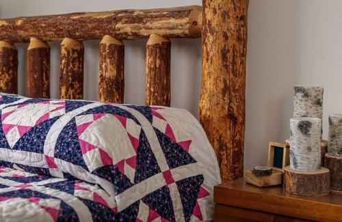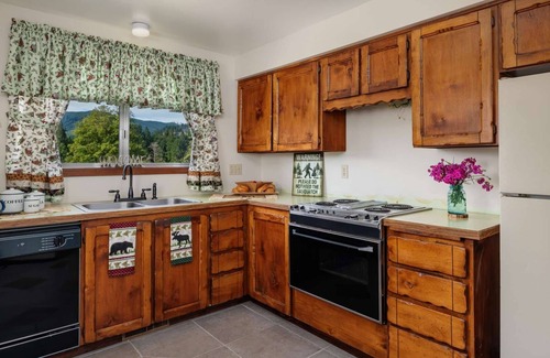 There are three bedrooms and two bedrooms with a spacious living space. The bunk room is set up with a quiet reading nook, and toys for your kids. It also has a small television to play movies for the children too. The back patio has a small fire pit and BBQ. In the living room there is a big screen television over the fireplace, with wood available upon request.