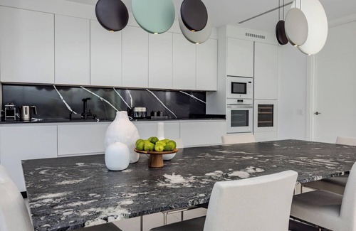 The designer kitchen with marble top working area, features high-quality appliances including large fridge, freezer, dishwasher, microwave, integrated oven and grill and an induction cooker. A large extravagant dining table crafted from a single slab of marble offers a sumptuous dining experience and also provides a spacious work area if required. A separate wine fridge and cooler will ensure your favourite local wines are always at the desired temperature. A separate laundry room provides separate high-quality washing machine and dryer as well ironing equipment.
